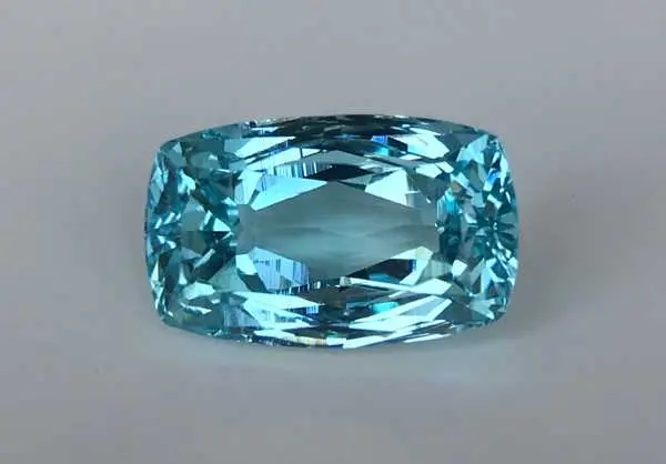 Интересный аквамарин пакистанского происхождения; огранка кушон выполнена в высоком качестве, полировка хорошая, при просмотре с площадки наблюдается легкая зональность. Голубой цвет средней насыщенности.