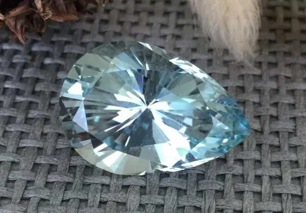 Красивый благородный драгоценный камень аквамарин в изящной форме огранки "груша". Это крупный представитель ювелирного волынского берилла, который сегодня считается уже коллекционным. Он имеет массу 17 карат и нежный светлый голубой цвет. Отметим первоклассную полировку камня, и искрящуюся игру света на гранях. Драгоценный голубой аквамарин будто создан для элегантной подвески - кулона в классическом стиле.