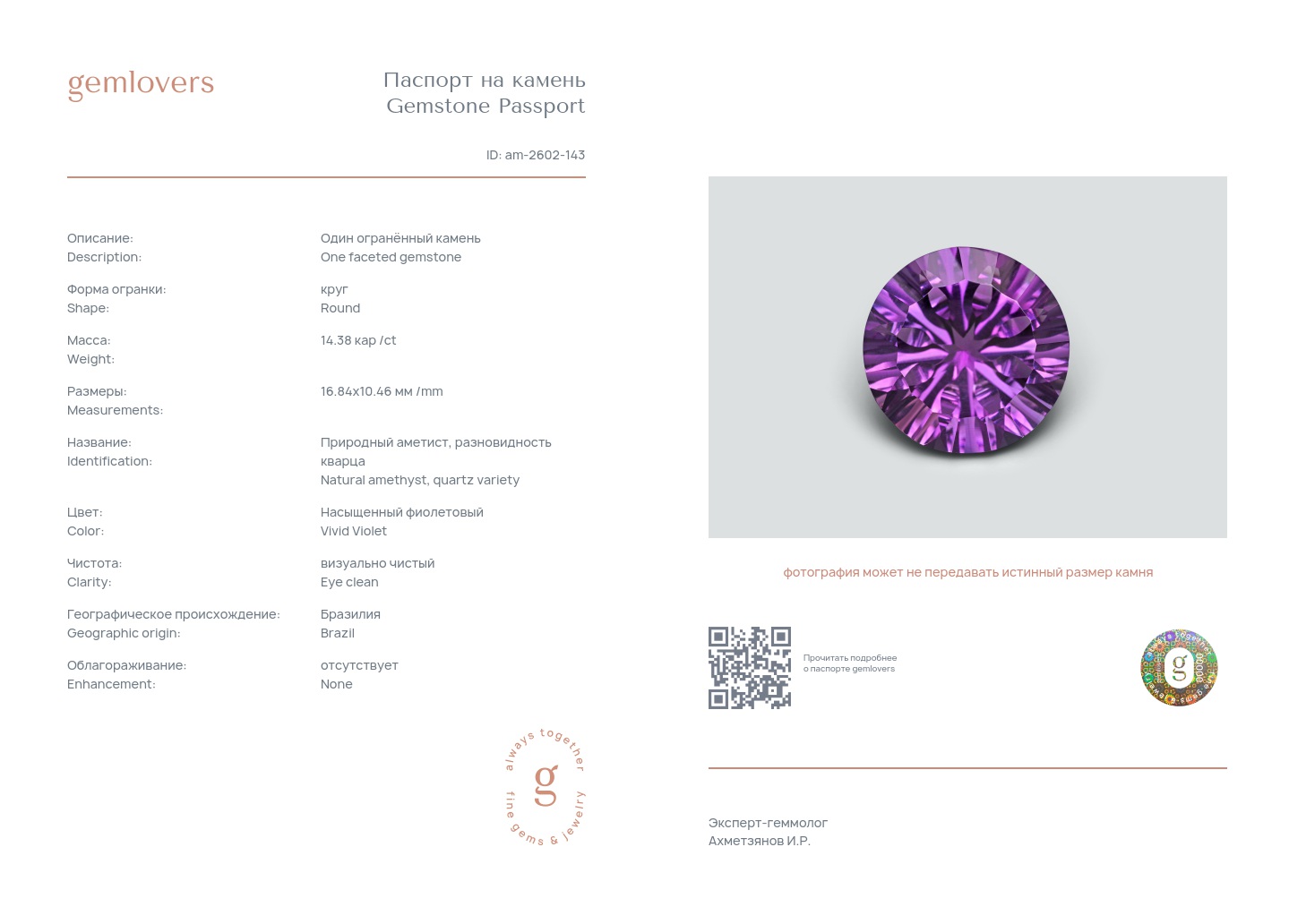 Все наши камни сопровождаются паспортами GEMLOVERS, подтверждающими соответствие камней заявленным характеристикам.