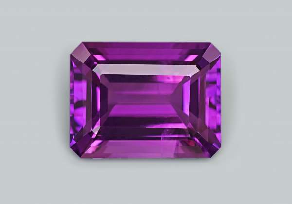Стильный экземпляр натурального аметиста из Бразилии. Камень крупный, эффектный, его масса составляет 32.55 карат. Размеры "лица" 21.84х18.48 мм. Яркая фиолетовая окраска. Посмотреть, как ограненный камень аметист играет при дневном свете, можно на видео.