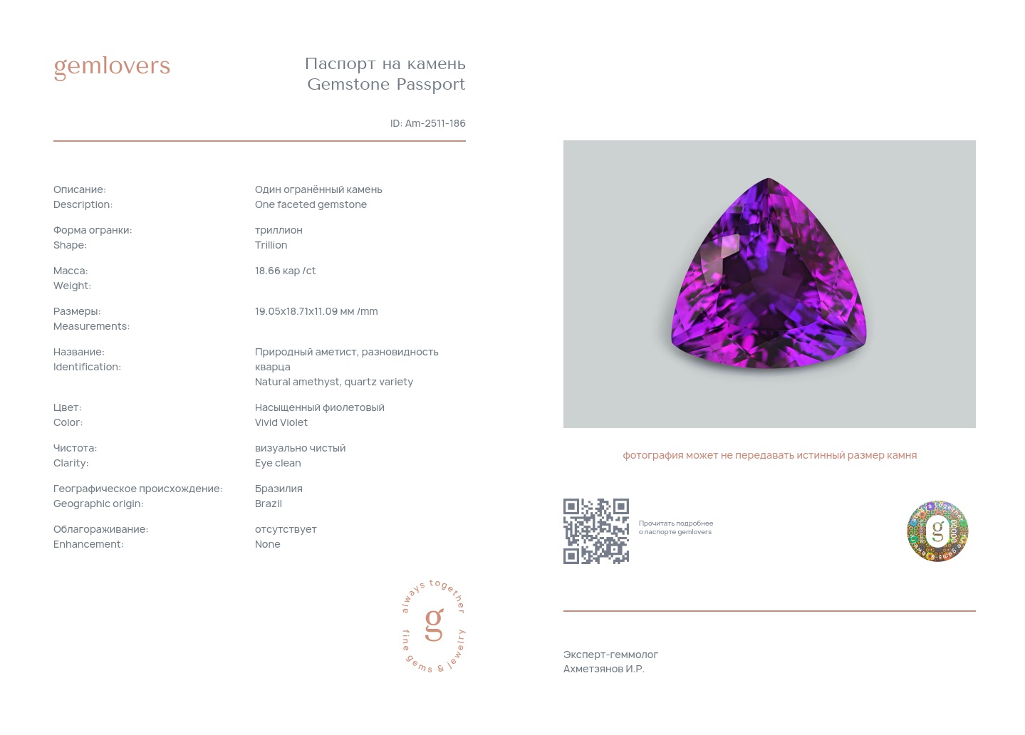 Все наши камни сопровождаются паспортами GEMLOVERS, подтверждающими соответствие камней заявленным характеристикам.
