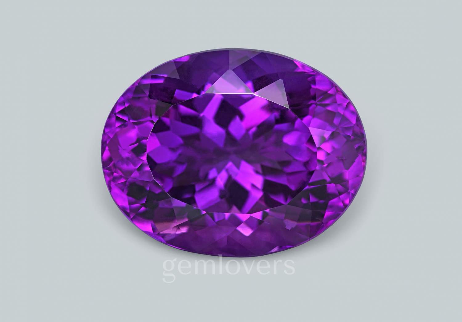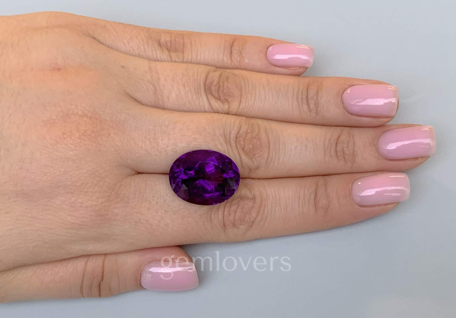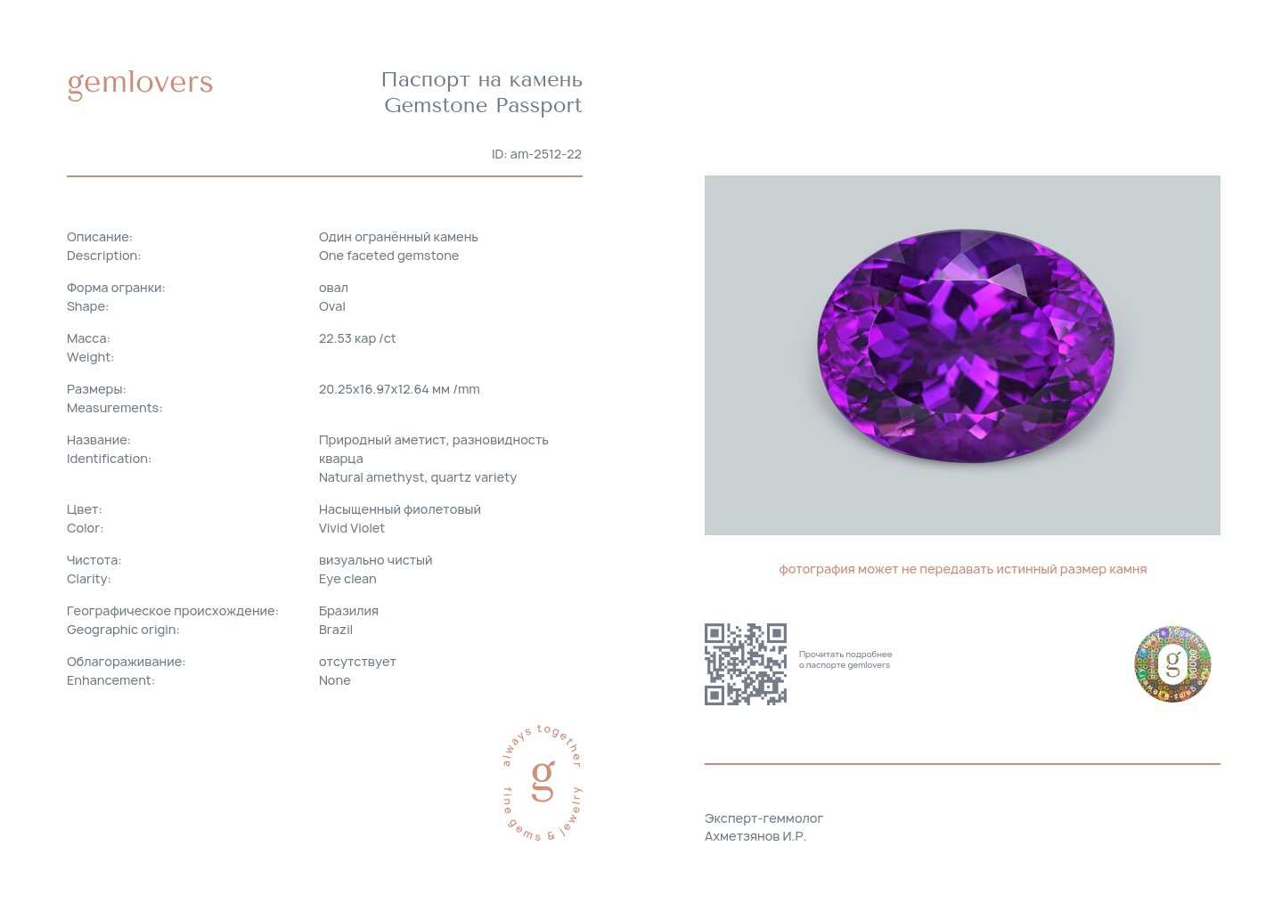 Шикарный цвет этого натурального аметиста - его изюминка, густой, насыщенно-фиолетовый, но не слишком темный. Отличная чистота, красивая форма овала. Аметист прибыл из Бразилии, родины множества самоцветов. Камень не подвергался облагораживанию. Масса - 22.53 карат.