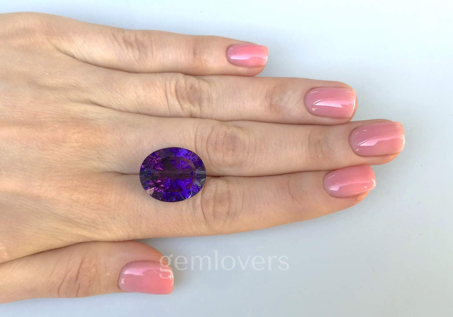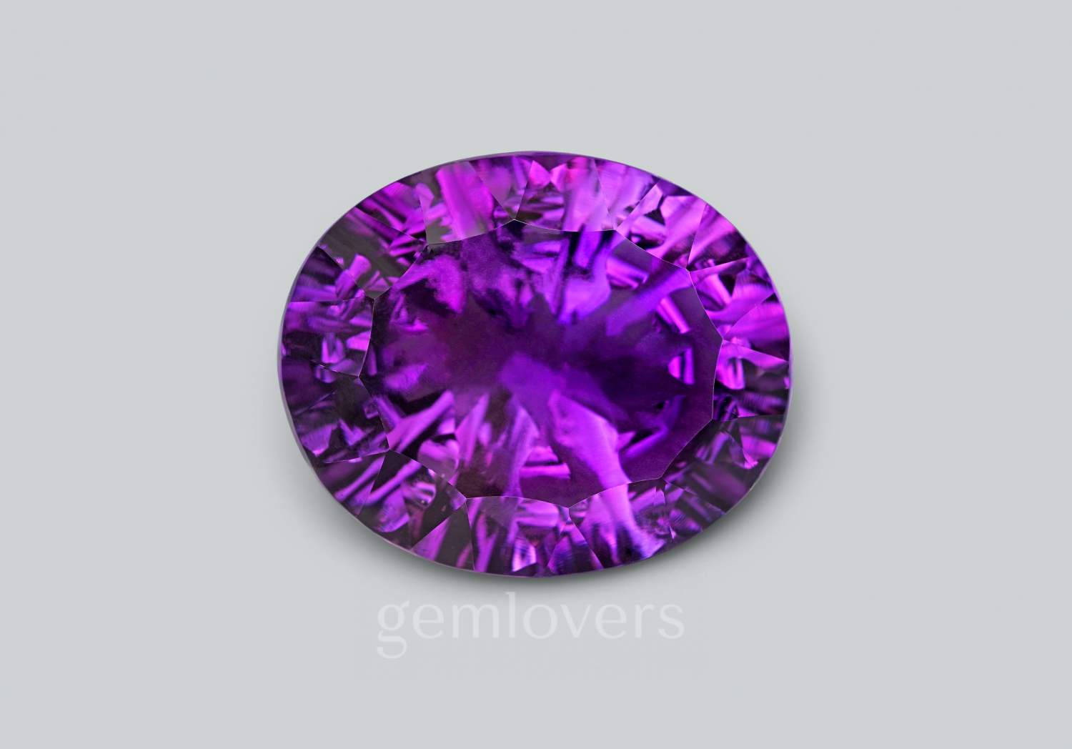 Красивый фиолетовый камень аметист - одна из самых популярных ювелирных разновидностей кварца. Происхождение этого аметиста – Бразилия. Обратите внимание на густой, но не темный фиолетовый цвет без зональности и видимых включений. Полноценная глубина павильона обеспечивает насыщенность цвета. Преимущества этого камня: гармоничная форма огранки, изящный вытянутый овал интересная огранка. Отличная чистота. Этот аметист - перспективный камень для крупного коктейльного кольца или броской затейливой подвески.