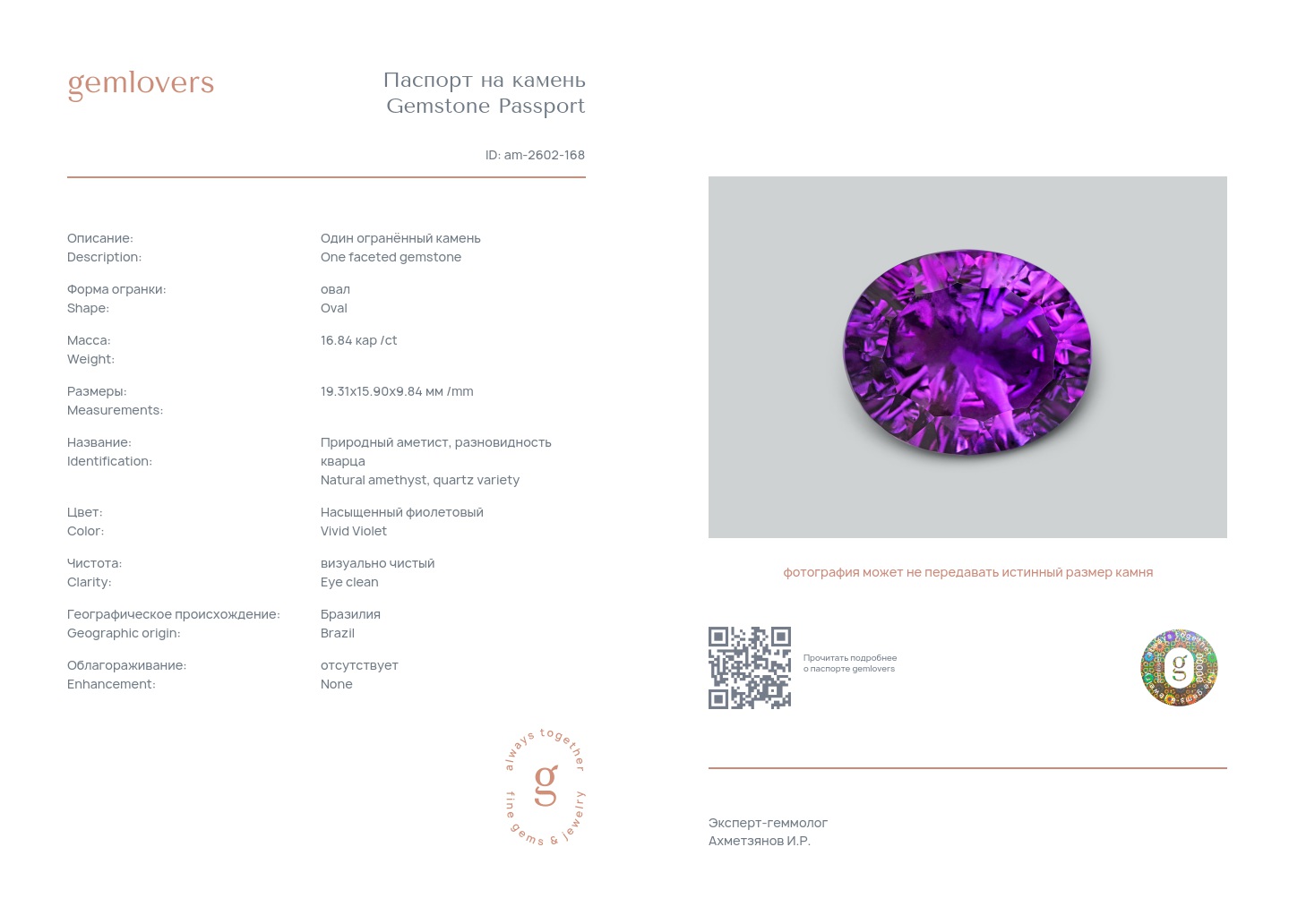 Все наши камни сопровождаются паспортами GEMLOVERS, подтверждающими соответствие камней заявленным характеристикам.