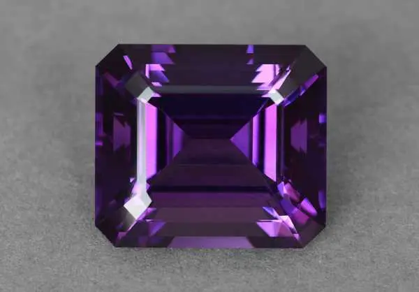 Крупный экземпляр натурального аметиста массой 37 карат имеет насыщенно-фиолетовую окраску, которая к тому же набрала интенсивность благодаря размеру. Чистота камня отличная, в нем отсутствуют видимые включения. Под небольшим углом к площадке видна естественная зональность, не влияющая на восприятие красоты камня. Качественная изумрудная (ступенчатая) огранка обеспечивает красивую игру света на гранях. Аметист был добыт в Бразилии. Необлагорожен.