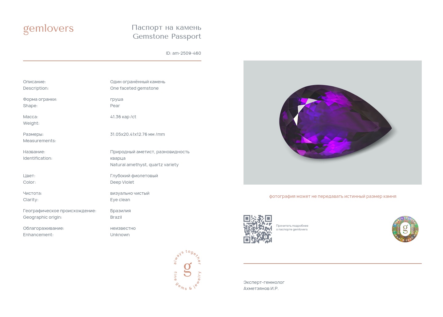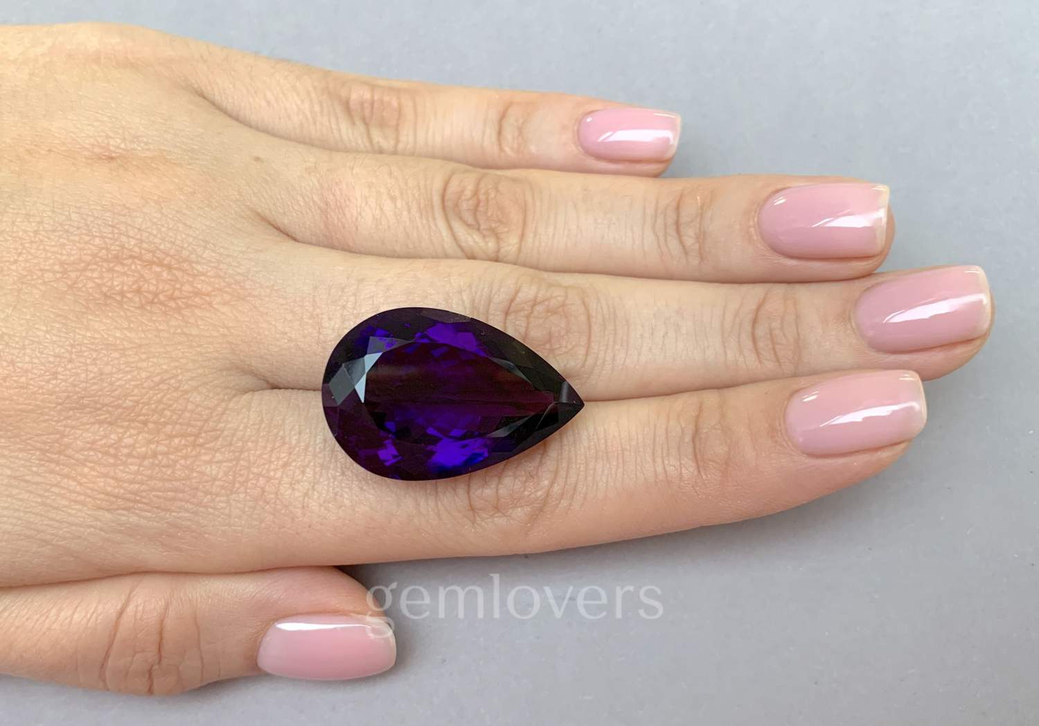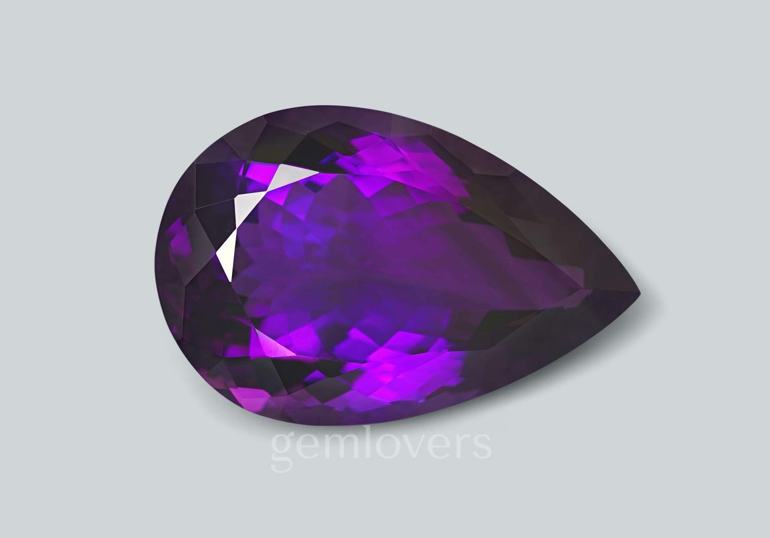 Великолепный крупный фиолетовый аметист появился в нашем каталоге! Масса - более 40 карат, точное значение - 41.36 карат. При насыщенной равномерной фиолетовой окраске и высокой чистоте этот камень - настоящий подарок! Место добычи - Бразилия. Бразильские аметисты считаются классикой. Этот экземпляр аметиста в огранке груша украсит любую коллекцию драгоценных камней и ювелирных изделий.