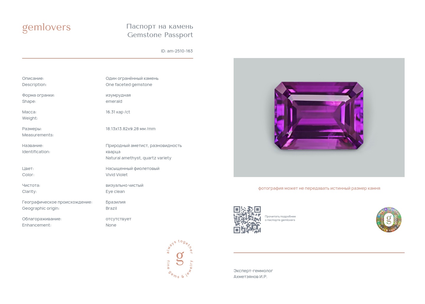 Все наши камни сопровождаются паспортами GEMLOVERS, подтверждающими соответствие камней заявленным характеристикам.