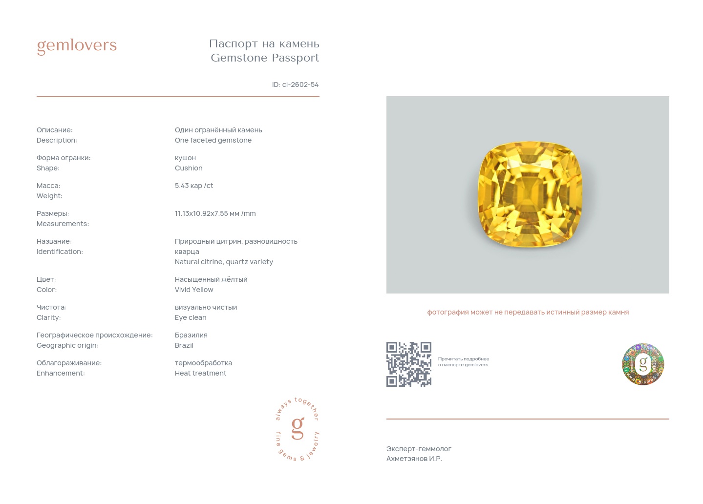 Все наши камни сопровождаются паспортами GEMLOVERS, подтверждающими соответствие камней заявленным характеристикам.