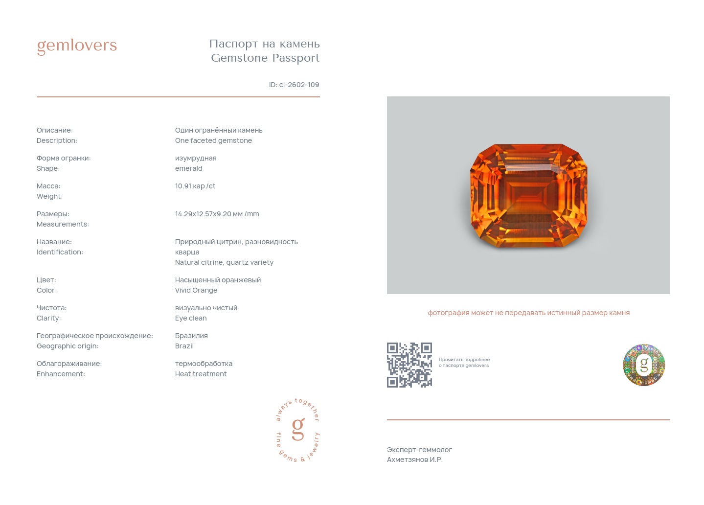Все наши камни сопровождаются паспортами GEMLOVERS, подтверждающими соответствие камней заявленным характеристикам.
