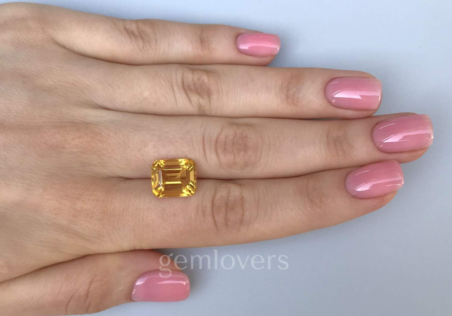 Цитрин - популярная ювелирная разновидность минерала кварц. Цвет этого цитрина ярко-желтый. Место добычи - Бразилия. Из-за больших объемов добычи цитринов их цена весьма доступна по сравнению с другими желтыми камнями: топазом, сапфиром, цирконом. Форма огранки - изумрудная. Масса - 5.81 карата.