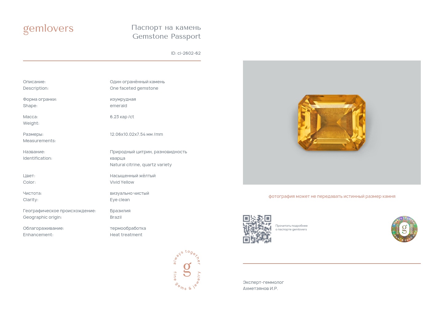 Все наши камни сопровождаются паспортами GEMLOVERS, подтверждающими соответствие камней заявленным характеристикам.