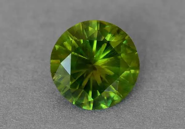 Любопытный лот в нашем каталоге: камень демантоид с выраженным включением "конский хвост" (horsetail). Это включение минерала биссолита, характерное для уральских месторождений зеленого граната демантоида. Оно выглядит как пучок тонких волокон. Такой демантоид украсит любую коллекцию драгоценных камней и минералов. Масса для демантоида ювелирного качества весьма существенная - 2.64 карата. Камень огранен в круглой форме, качество огранки и полировки выполнено на европейском уровне.