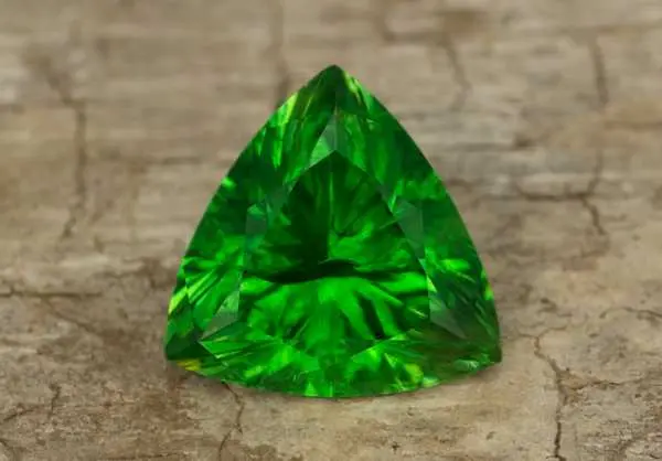Изящный образец ювелирного граната демантоида в огранке триллион. Камень такого размера и с подобной глубиной цвета - большая редкость. Зеленый гранат демантоид - лучший выбор ценителей блеска и игры света. Он обладает высочайшей дисперсией, благодаря которой не пропадет ни при каком освещении. Российские демантоиды - это камни, за которыми «охотятся» многие коллекционеры по всему миру, ведь добываются они в крайне малых количествах, а их ценность очень высока.
