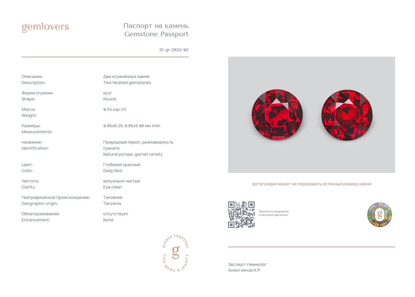 Все наши камни сопровождаются паспортами GEMLOVERS, подтверждающими соответствие камней заявленным характеристикам.