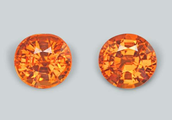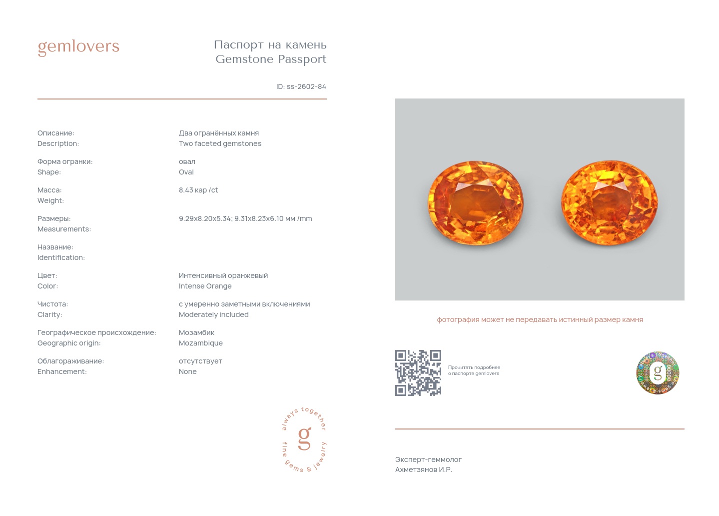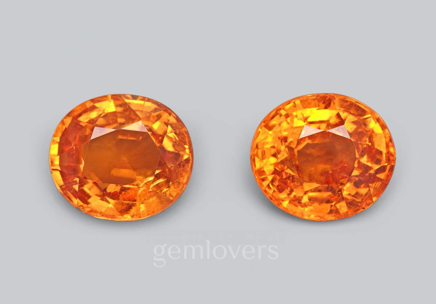 Если Вам необходима пара ярких природных драгоценных камней для украшений, серег или запонок, посмотрите эти спессартины. Они отличаются насыщенным оранжевым цветом. Пара природных оранжевых гранатов достаточно крупная, общая масса двух камней составляет 8.43 карат. Огранка спессартинов выполнена в форме овал. Происхождение - Мозамбик.