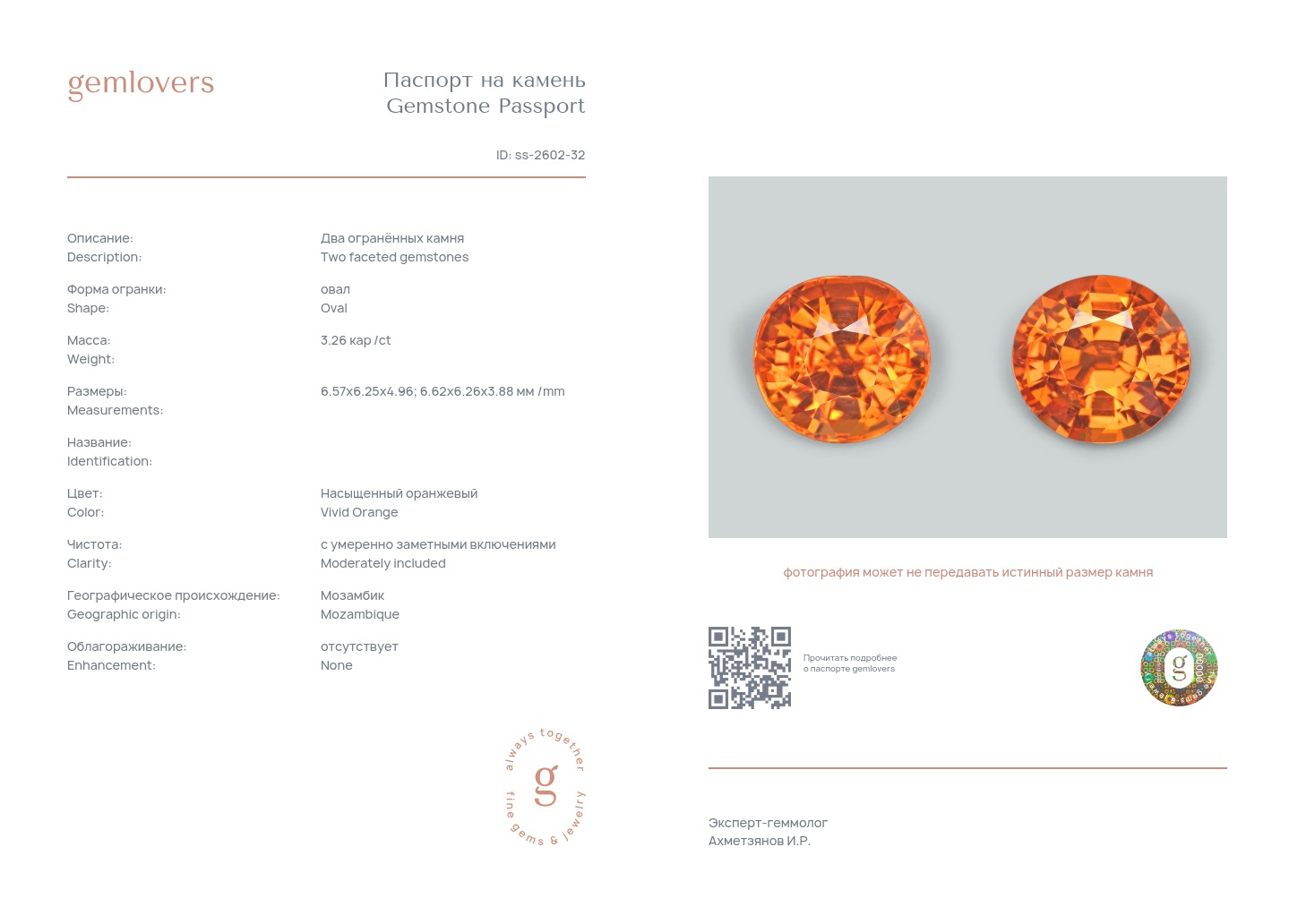 Все наши камни сопровождаются паспортами GEMLOVERS, подтверждающими соответствие камней заявленным характеристикам.