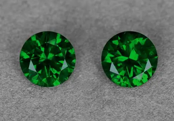Очень хорошая по визуальной схожести пара ограненных демантоидов из России, Урал. Цвет очень густой, насыщенный зеленый (1-й цвет!). Общая масса пары - 2.11 карат. Огранка - круглая бриллиантовая, выполнена на хорошем международном уровне, камни сияют! Эти парные демантоиды в серьгах станут истинным украшением вашего ювелирного гардероба.