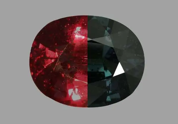 Уникальный гранат с александритовым эффектом 11,30 карат в коллекции Gem Lovers. При дневном свете наблюдается зеленый с синеватым оттенком, под лампами накаливания - пурпурно-красный. Мы приводим фотографии включений, сделанные под микроскопом. Фото сняты при разных типах освещения (дневное освещение и свет лампы накаливания). На одном фото в правой части камня видна ростовая зональность. На другом представлены бесцветные включения цирконов с тензорными трещинками. А на последней фотографии - интересное включение в виде кометы (тёмный кристалл рутила с "хвостом"). Таких редких "кометообразных" включений в этом гранате около десятка.