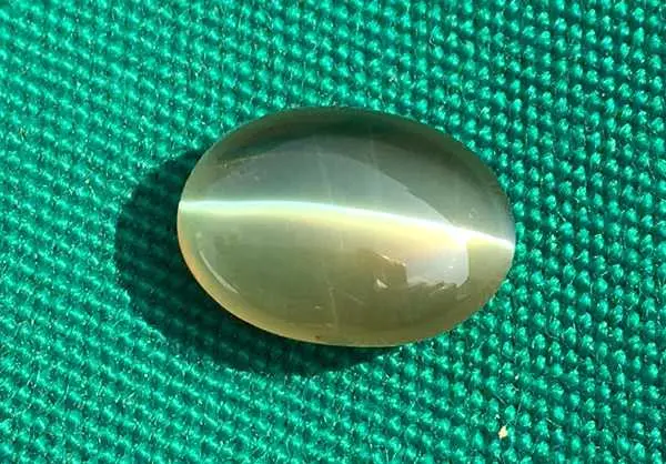 Редкий ювелирный камень – природный хризоберилл с оптическим эффектом кошачьего глаза Другое название такого хризоберилла – цимофан.