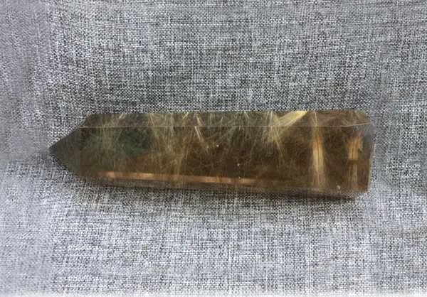 Представляем вашему вниманию крупный коллекционный кристалл дымчатого кварца с красивыми золотыми включениями минерала рутила.