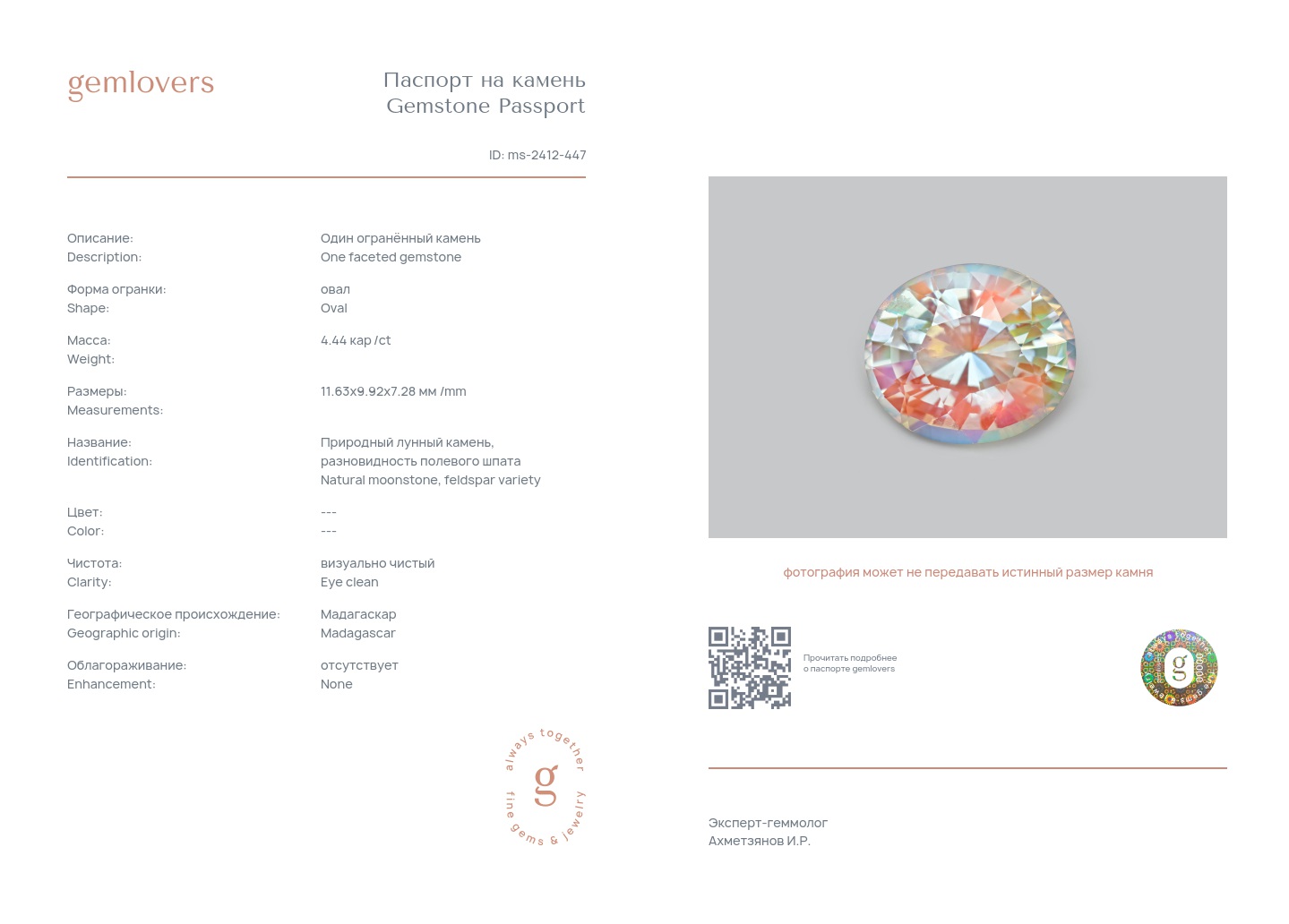 Прекрасный натуральный лунный камень мадагаскарского происхождения. Огранен в форму классического овала, он станет примой вашего ювелирного изделия. Этот камень с изумительным многоцветным отблеском - адуляресценции. Масса камня - 4.44 карат.