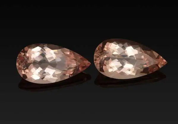 Изумительные, крупные, общей массой 24.96 карат, груши редкой разновидности берилла морганит так и просятся в серьги и выглядят весьма эффектно. Оттенок морганита - персиково-розовый, нежный и жизнерадостный. Также очень важно, что пара морганитов не была подвергнута облагораживанию с целью улучшения цвета, то есть оттенок природный. Такой цвет прекрасно смотрится в окружении желтого или белого золота. Камни были добыты в Мозамбике.