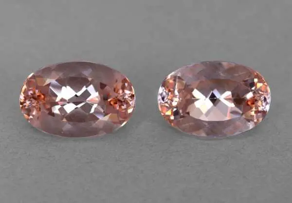 Розовые бериллы морганиты - редкие красивые камни. Пара натуральных морганитов имеет общую массу 13.72 карата. Форма удлиненного овала смотрится интересно и гармонично. Высокая чистота, нет включений и трещин. Цвет - выраженный персиково-розовый. Место добычи - Бразилия.