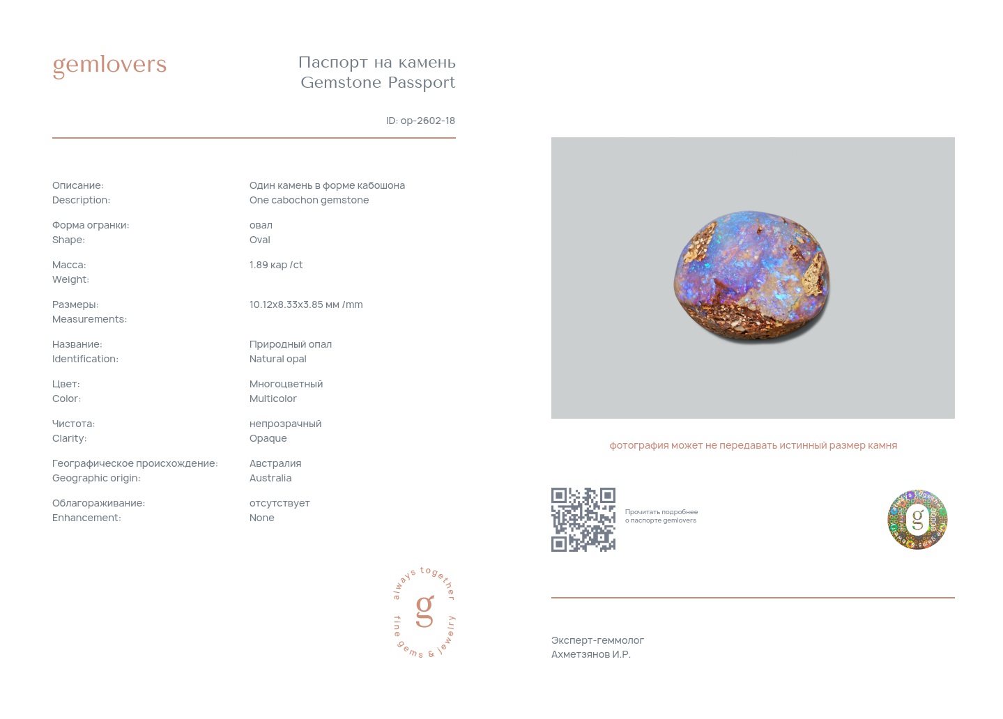 Все наши камни сопровождаются паспортами GEMLOVERS, подтверждающими соответствие камней заявленным характеристикам.