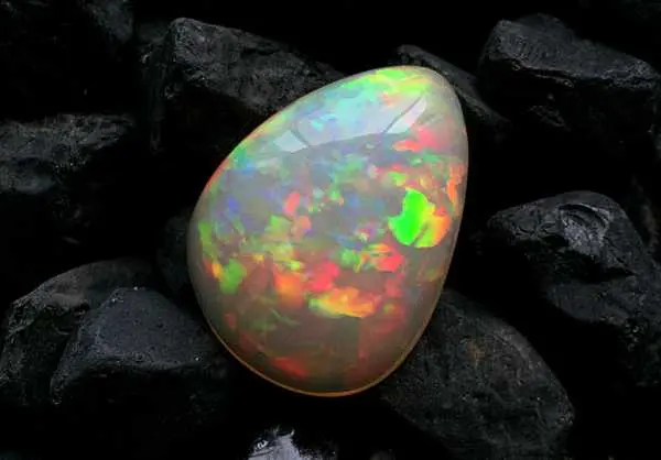 Великолепный представитель белых благородных опалов, обработанный в форме кабошона "free form". Он поражает воображение солидным размером и массой почти 30 карат. Шикарная опалесценция напоминает огненный закат, когда лучи закатного солнца играют на обрывках перьевых облаков над горизонтом. Обязательно взгляните на камень вживую, как он переливается, в движении: это восхитительно красиво...