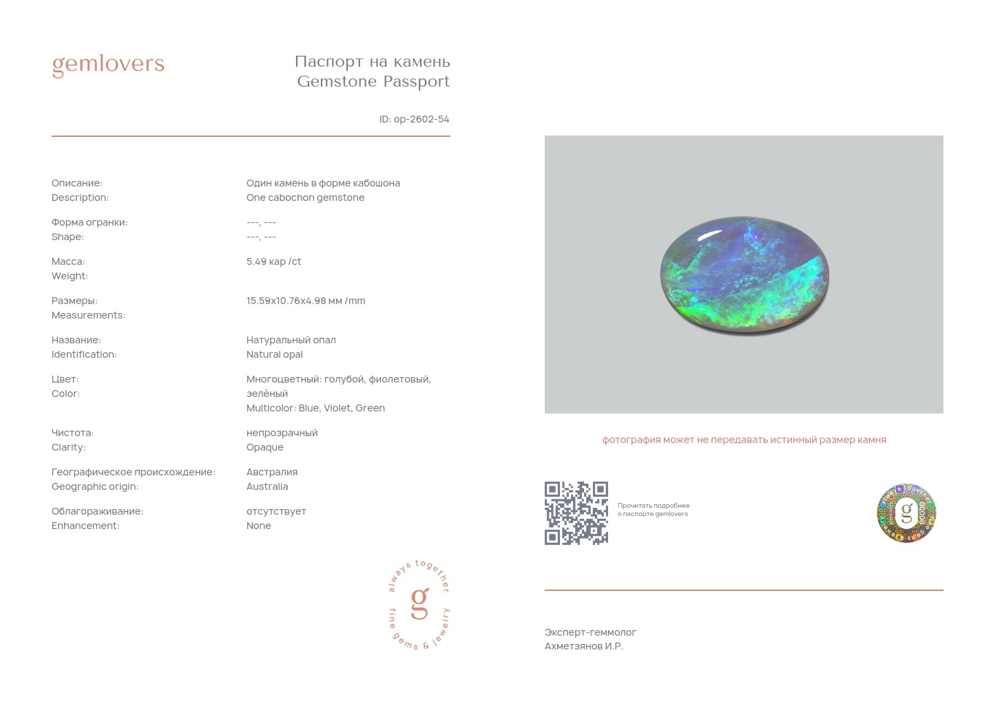 Все наши камни сопровождаются паспортами GEMLOVERS, подтверждающими соответствие камней заявленным характеристикам.