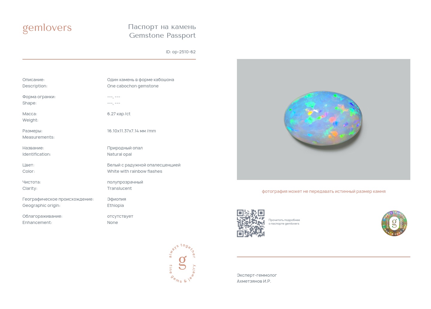 Все наши камни сопровождаются паспортами GEMLOVERS, подтверждающими соответствие камней заявленным характеристикам.