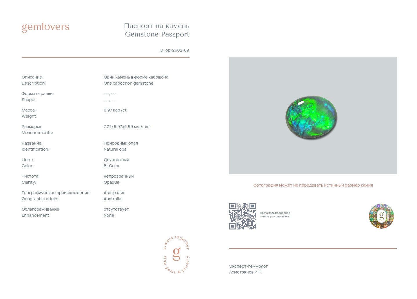 Все наши камни сопровождаются паспортами GEMLOVERS, подтверждающими соответствие камней заявленным характеристикам.