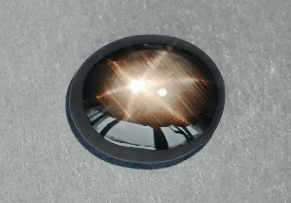 Классическая форма обработки звездчатых сапфиров - кабошон круглой или овальной формы. Считается, что правильно сориентированные при огранке кабошоны максимально раскрывают эффект звезды. Особенно хорошо звезда читается в черных непрозрачных сапфирах из Таиланда за счет контраста. Их также называют блэк стар сапфирами (black star sapphire). Масса этого экземпляра - 7.76 карат. Камень не подвергался облагораживанию.