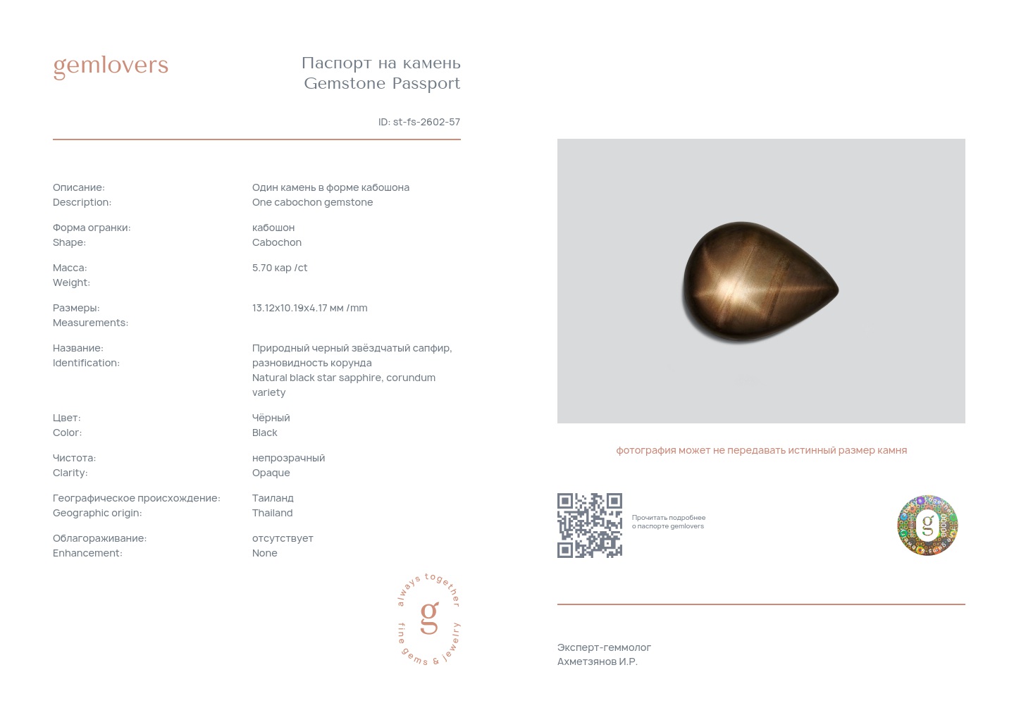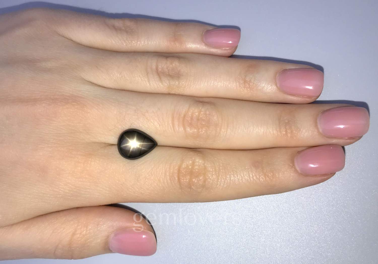 Классическая форма обработки звездчатых сапфиров - кабошон круглой или овальной формы, груши реже. Считается, что правильно сориентированные при огранке кабошоны максимально раскрывают эффект звезды. Особенно хорошо звезда читается в черных непрозрачных сапфирах из Таиланда за счет контраста. Их также называют блэк стар сапфирами (black star sapphire). Масса этого экземпляра - 5.70 карат. Камень не подвергался облагораживанию.