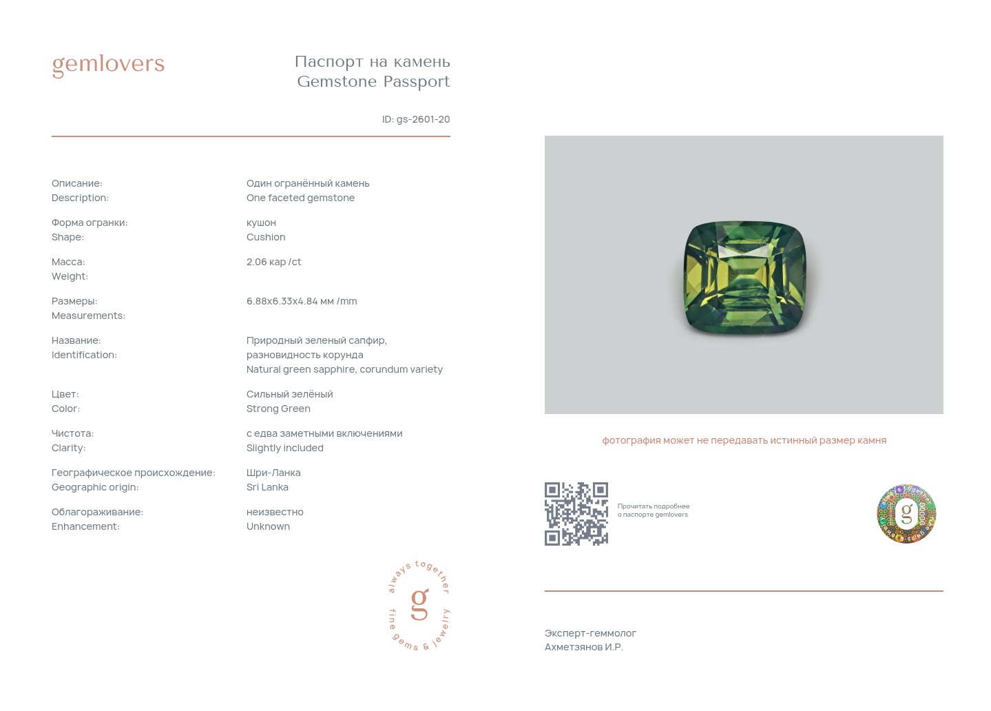 Перед Вами образец благородного камня сапфира насыщенного зеленого цвета. Форма огранки - классический кушон. Камень обладает хорошей игрой и полировкой. Масса 2.06 карата, Цена сапфиров зависит от множества факторов, в том числе растет по мере увеличения массы: чем крупнее камень, тем выше его стоимость. Однако стоимость зеленых сапфиров, как правило, ниже стоимость синих сапфиров. Происхождение Шри-Ланка.
