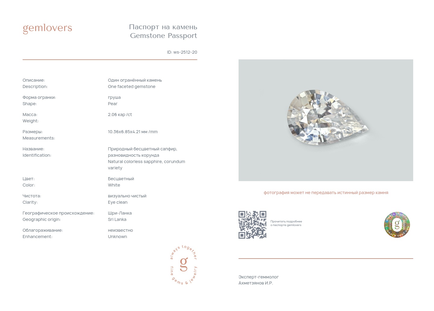 Бесцветный или белый натуральный сапфир - редкий самоцвет, разновидность минерала корунда, добывается в ювелирном качестве всего на нескольких месторождениях. Представленный экземпляр в огранке "груша" великолепен. Он весит более 2 карат, прозрачный и чистый, имеет точеный силуэт и отличную полировку. Происхождение - Шри-Ланка. Знатоки драгоценных камней часто выбирают натуральные белые сапфиры в качестве альтернативы белоснежным бриллиантам.