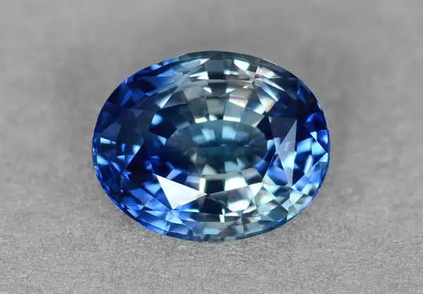 Сапфир фантазийной окраски демонстрирует одновременно два цвета в одном экземпляре: синий и белый, так что его вполне можно назвать двухцветным или биколор (bi-color). Огранщик мастерски обыграл такую зональность в кристалле, разместив синие зоны практически симметрично относительно белой. Синие и белые цвета интересно переотражаются в гранях камня, создавая неповторимую игру бликов и всполохов.