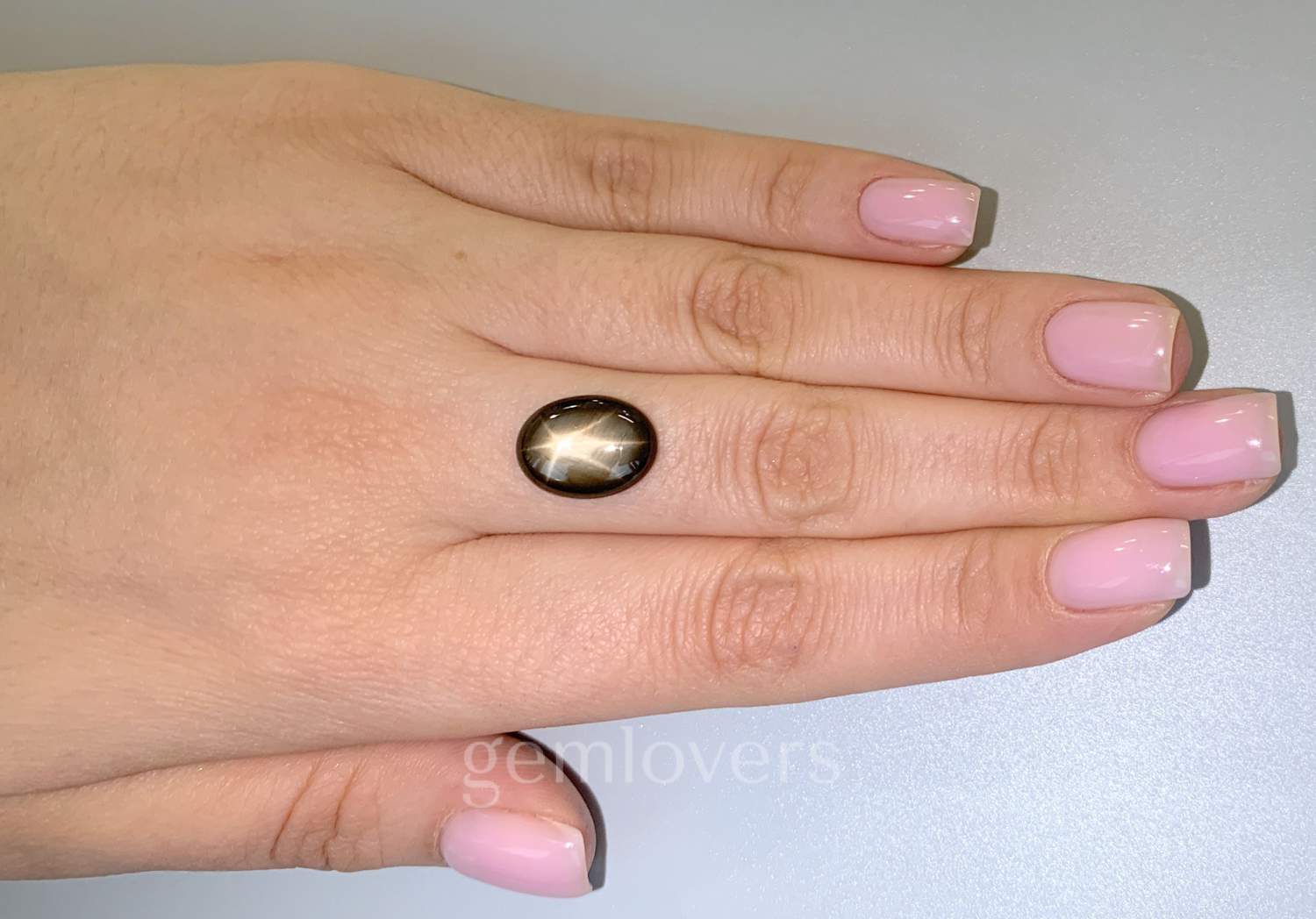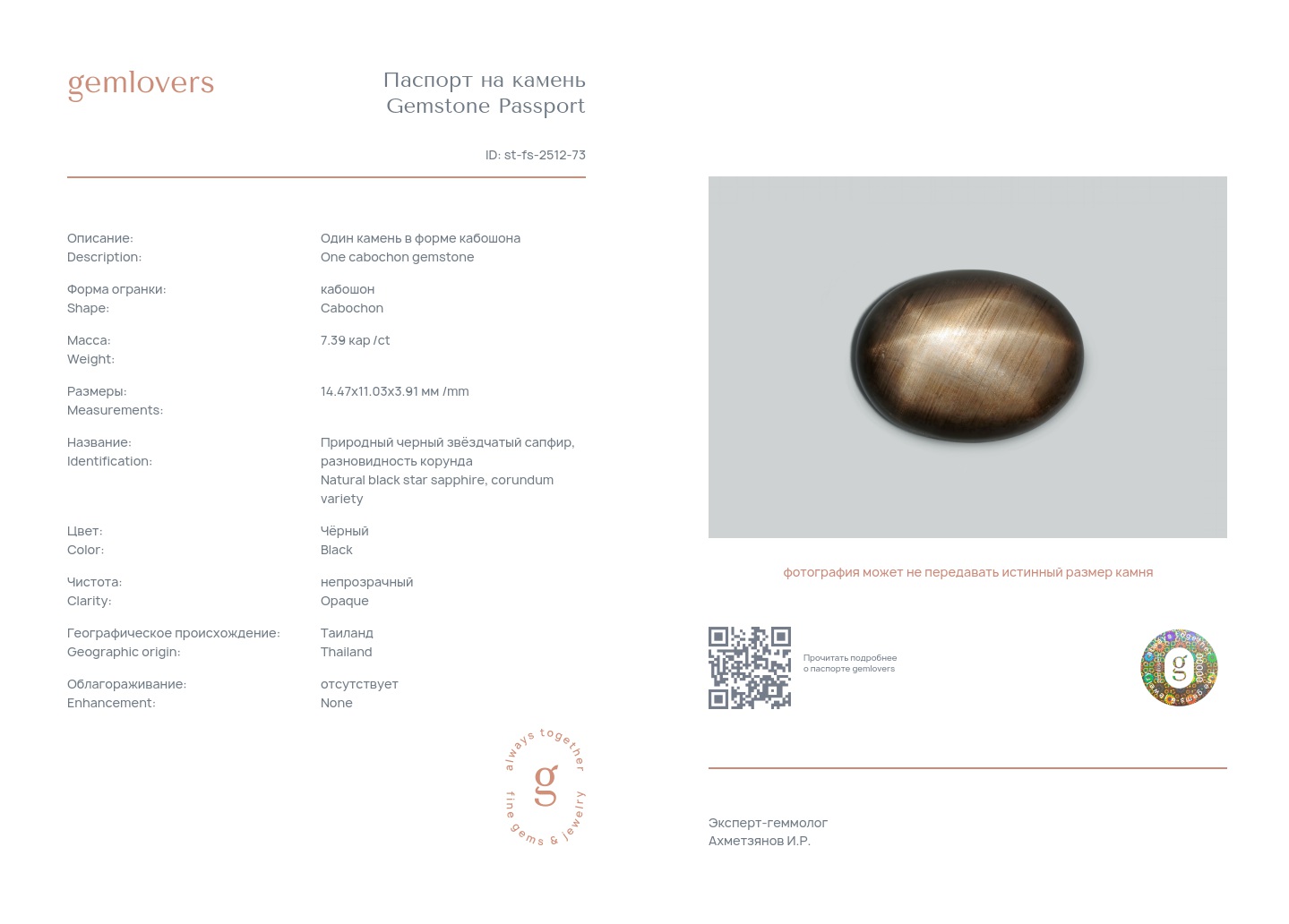 Черный сапфир со звездой в ювелирных изделиях смотрится стильно и необычно. Не так много известно натуральных драгоценных камней черного цвета с эффектом звездчатости, среди них - диопсид и черные гранаты. Сапфиры отличаются высокой твердостью, 9 по шкале Мооса. Данный экземпляр черного сапфира имеет каратность 7.39 ct. Камень добыт в Таиланде. Негретый.