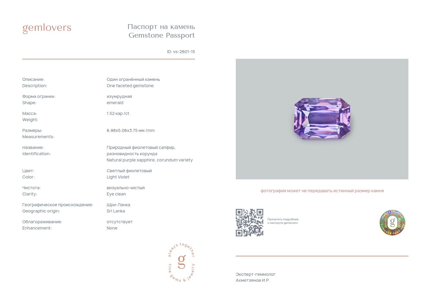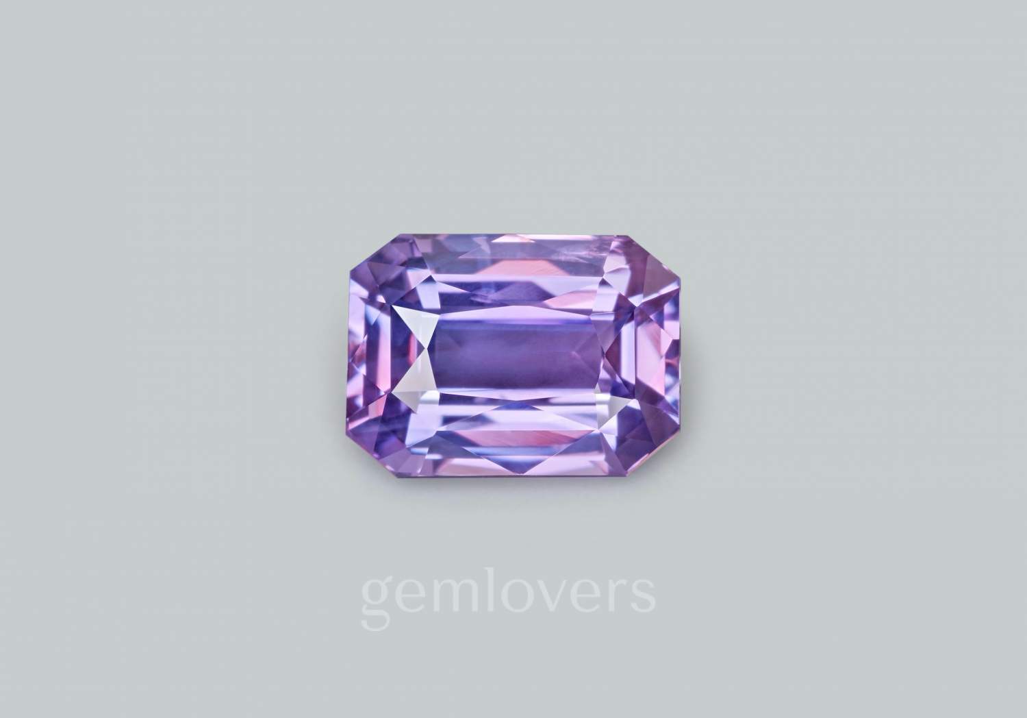 Редкий по цвету лот - изумительный светлый фиолетовый сапфир. Фиолетовый цвет встречается у минерала корунда нечасто. Окраска складывается из двух составляющих: синего и розово-пурпурного цветов, поэтому они могут присутствовать в образце в качестве дополнительных оттенков. Огранка ступенчатая изумрудная. Шри-Ланка.