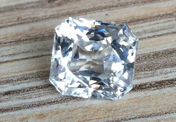 Этот бесцветный сапфир ювелирного качества – обладатель отличной огранки и правильных пропорций. При рассмотрении камня под разными углами видна яркая дисперсия, что делает его таким похожим на крупный бриллиант.