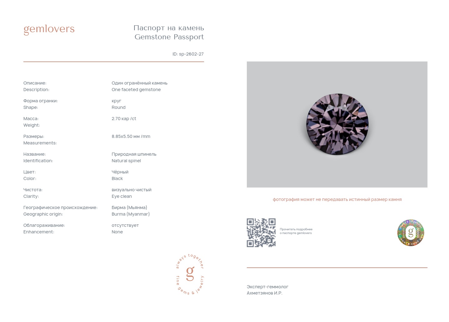 Все наши камни сопровождаются паспортами GEMLOVERS, подтверждающими соответствие камней заявленным характеристикам.