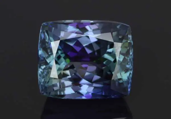 Все мы привыкли к тому, что танзаниты, как правило, имеют насыщенный сине-фиолетовый цвет. Однако немногим известно, что природные (необлагороженные) танзаниты могут сочетать в себе одновременно несколько разных цветов. Данный экземпляр имеет синий, фиолетовый и зеленый цвета. В геммологии данный эффект объясняется двумя особенностями: плеохроизм (оптический эффект) и полихромность (цветовые зоны). Но не всегда благородные негретые танзаниты имеют такую живую окраску, а тем более полихромность, особенно в большом весе. Чаще необлагороженные танзаниты имеют нечетко выраженную полихромность, при которой все цвета смешиваются, и в итоге камень выглядит серым. Этот фактор несомненно сказывается на их рыночной цене.