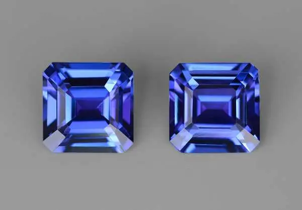 Если вы подыскиваете варианты синих камней для серег или запонок, обратите внимание на эту пару. Квадратные танзаниты смотрятся стильно, лаконично. Танзаниты тщательно подобраны по цвету, их окраску можно описать как насыщенный сине-фиолетововый. Общая масса двух камней - 6.87 карат. Отличная чистота. Место добычи - Танзания.