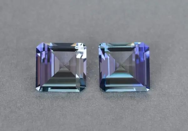 Эта пара полихромных танзанитов - просто космос! Плеохроизм танзанита раскрыт удивительным образом, под разными углами зрения в камнях появляются то синие, то фиолетовые, то зеленоватые оттенки. Интересна огранка: фантазийные квадраты с необычным рисунком граней станут основой оригинальных серег. Обязательно посмотрите видео, эти танзаниты - настоящая магия!