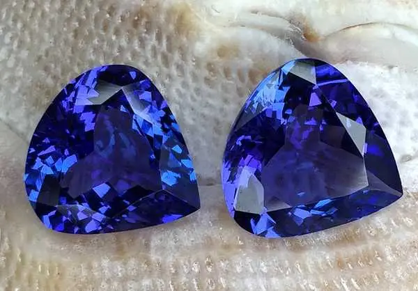 Отметим высокую чистоту этой пары и необычную фантазийную форму огранки, груши, близкие к форме сердца. Цвет заслуживает отдельного описания: насыщенный синий, с незначительным фиолетовым оттенком. При просмотре этого камня под разными углами окраска кажется различной.