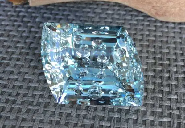Представленный камень голубой топаз - уникальное художественное произведение ограночного искусства. Он выполнен в единственном экземпляре, в необычной технике, сочетающей высококлассную огранку и резьбу по камню. Этот экземпляр благодаря высокой чистоте и деликатному голубому цвету напоминает застывшую морскую воду. Если всмотреться, внутри интересно блестят и переотражаются воздушные пузырьки, создавая непередаваемый словами эффект!