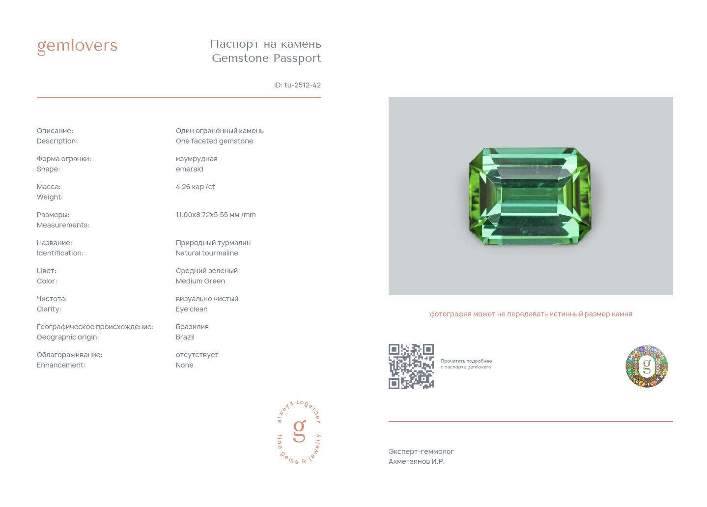 Зеленый бразильский турмалин без облагораживания 4.26 карат